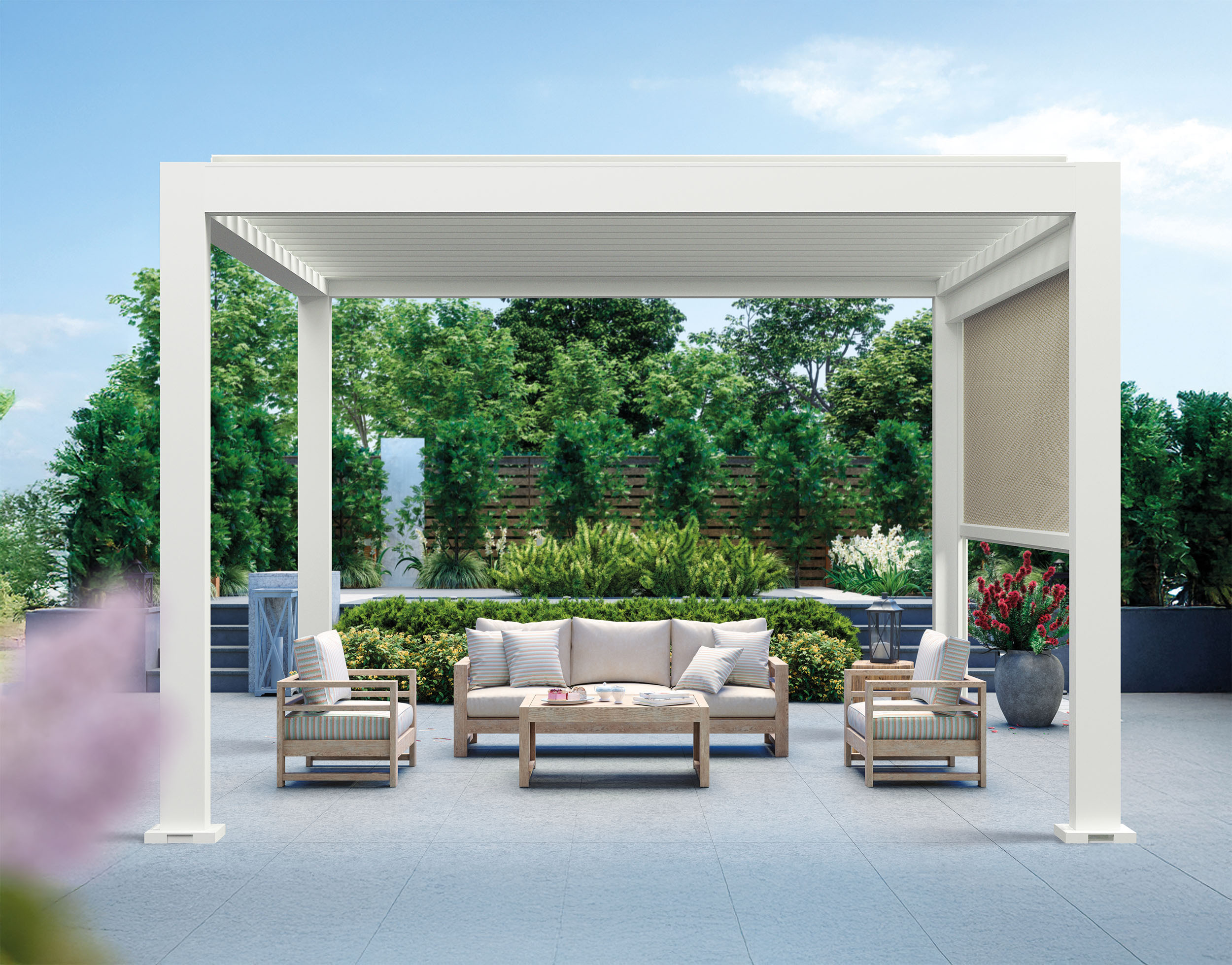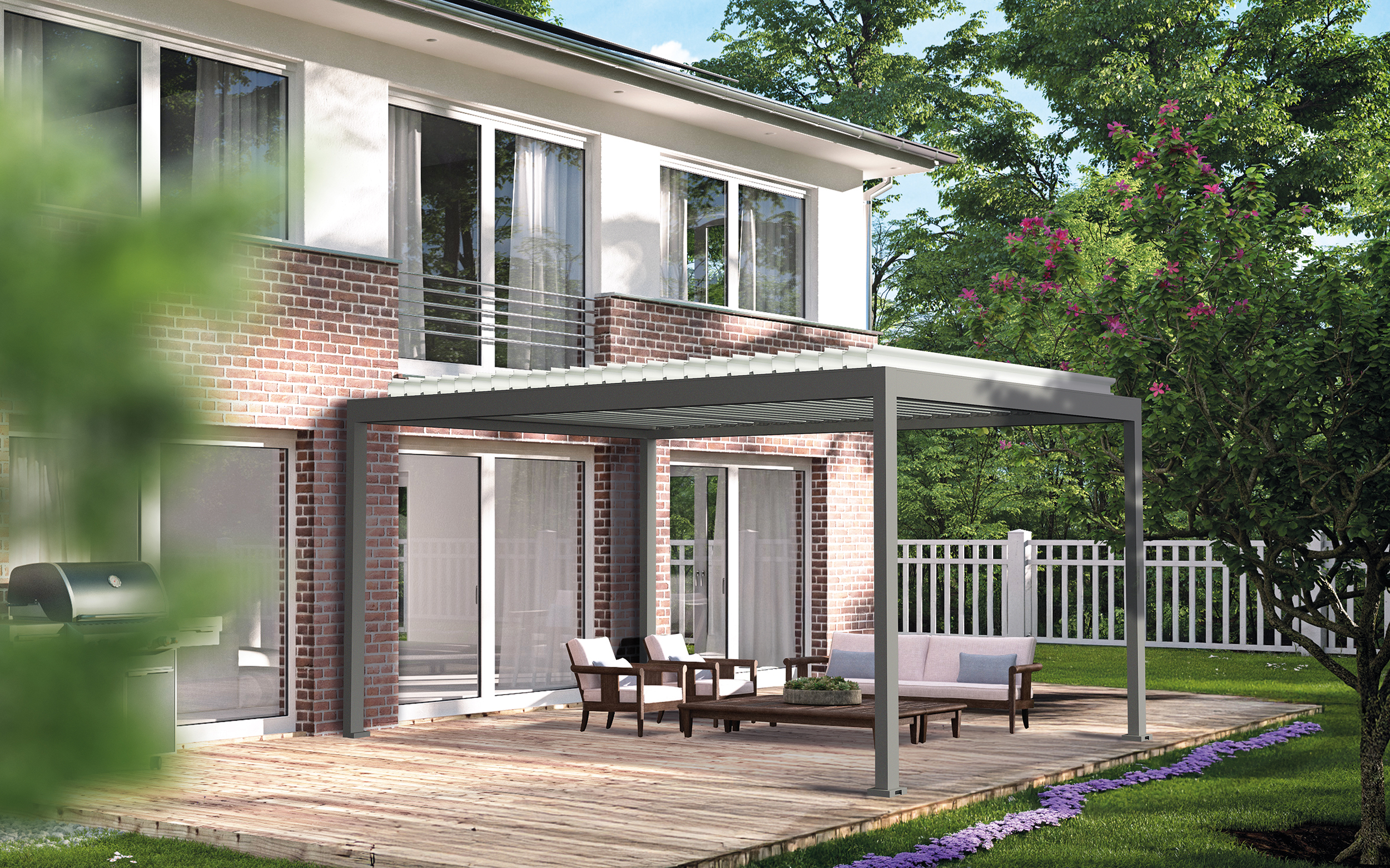Pose en façade, structure RAL 7016, lames blanches, store.